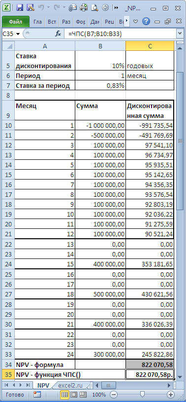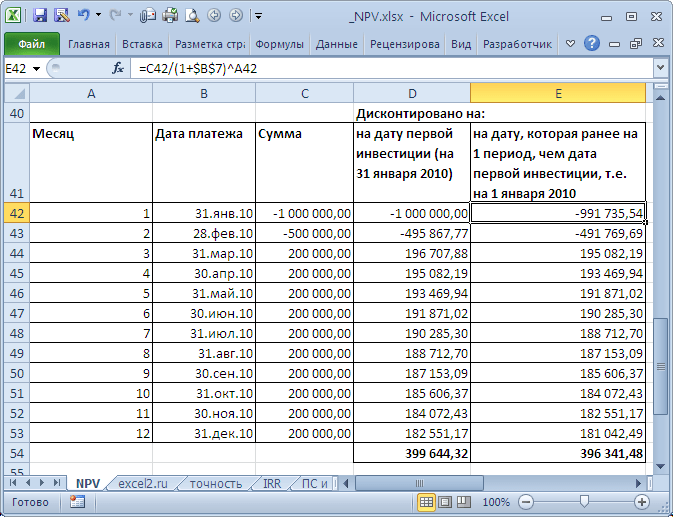 и формулами (вычисление приведенной стоимости каждой суммы). Из таблицы видно, что уже первая сумма (инвестиция) дисконтирована (-1 000 000 превратился в -991 735,54). Предположим, что первая сумма (-1 000 000) была перечислена 31.01.2010г., значит ее приведенная стоимость (-991 735,54=-1 000 000/(1+10%/12)) рассчитана на 31.12.2009г. (без особой потери точности можно считать, что на 01.01.2010г.)
