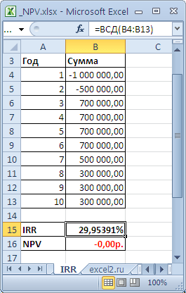 Расчеты в функции ЧИСТВНДОХ() производятся по формуле: