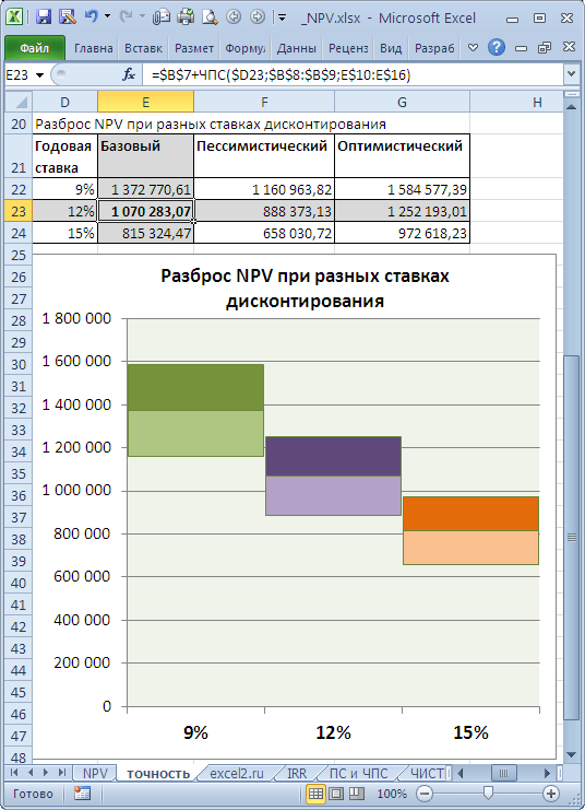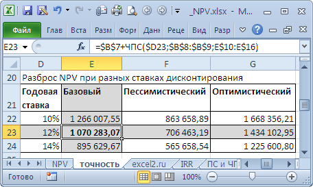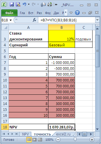 В таблице NPV подсчитан двумя способами: через функцию ЧПС()